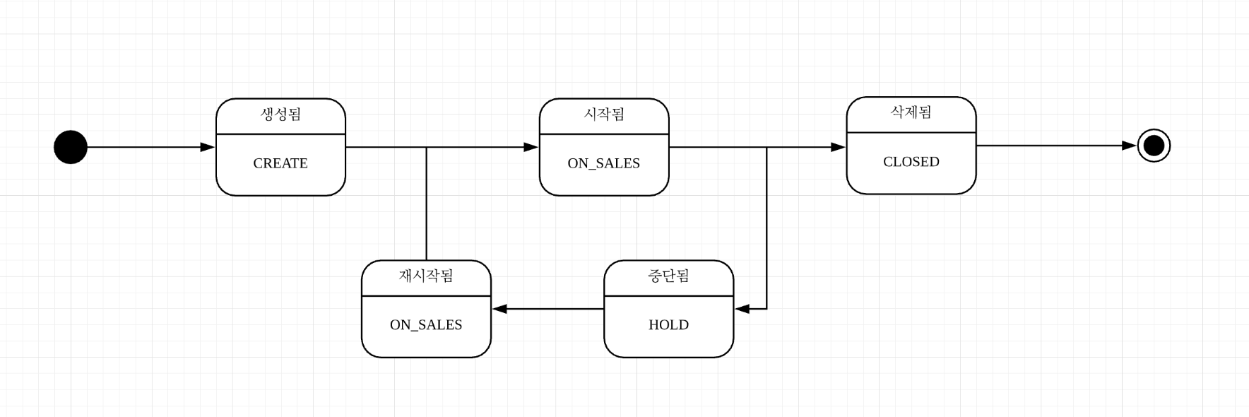 물건 생성 > 판매중 > 판매 중지 > 판매 종료 > 다시 판매 중 > …