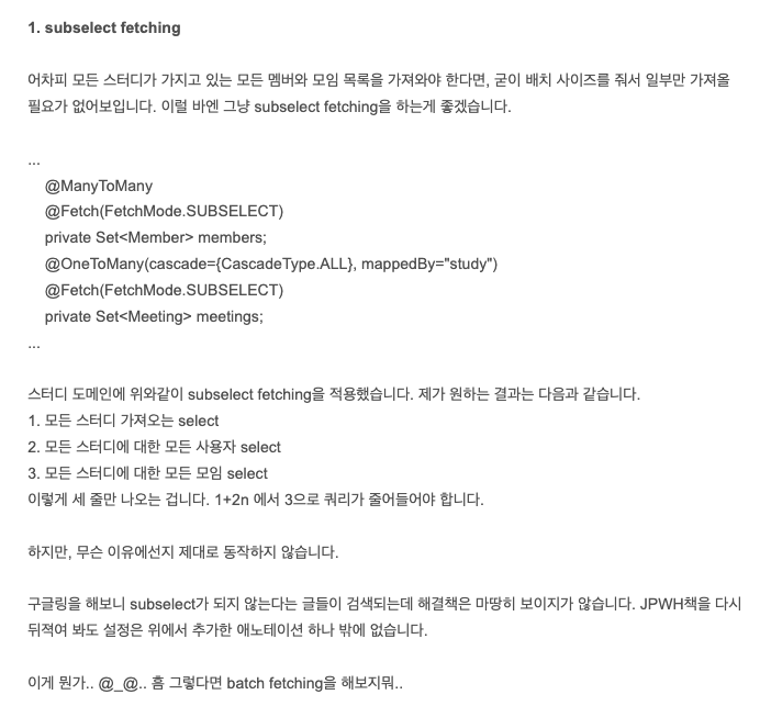 그러던 중, 코드를 살펴보던 중 처음 보는 어노테이션 @Fetch(FetchMode.SUBSELECT) 가 있었습니다.