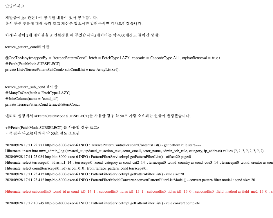 JPA 를 활용하다가 문제를 하나 맞딱뜨렸습니다. 퇴근하기 10분전, 동료분의 호출로 위 그림처럼 시간이 오래걸리는 경우가 발생했습니다. 처음 보는 코드에서 어디서 발생했는지 알 수 없는 상황에서 겉으로 보기에는 아무런 문제가 없었습니다.