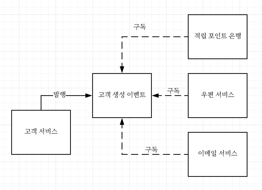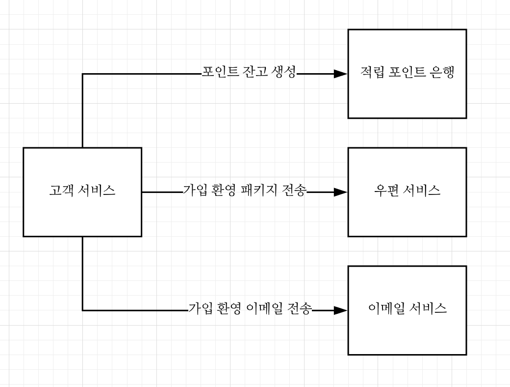 코레오그래피 방식에서는 고객 서비스가 비동기 방식으로 '고객이 생성되었다' 라는 이벤트를 발산할 뿐입니다. 적립 포인트 은행, 우편 서비스, 이메일 서비스는 모두 아래 그림과 같이 구독하고 적절히 행동할 뿐입니다. 이 방식이 확실하게 느슨한 결합을 이끌어냅니다. 만약 다른 서비스가 생성과정에 참여하고자 한다면 단지 이벤트를 구독하고 필요할 때 작업을 수행하게 하면 됩니다.