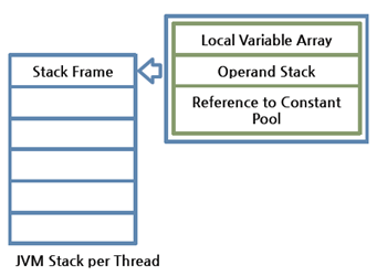 각 스택 프레임은 지역 변수 배열(Local Variable Array), 피연산자 스택(Operand Stack), 현재 실행 중인 메서드가 속한 클래스의 런타임 상수 풀에 대한 레퍼런스를 갖는다. 지역 변수 배열, 피연산자 스택의 크기는 컴파일 시에 결정되기 때문에 스택 프레임의 크기도 메서드에 따라 크기가 고정된다.- 지역 변수 배열: