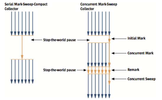 다음 그림은 Serial GC와 CMS GC의 절차를 비교한 그림이다. 그림에서 보듯이 CMS GC는 지금까지 설명한 GC 방식보다 더 복잡하다.