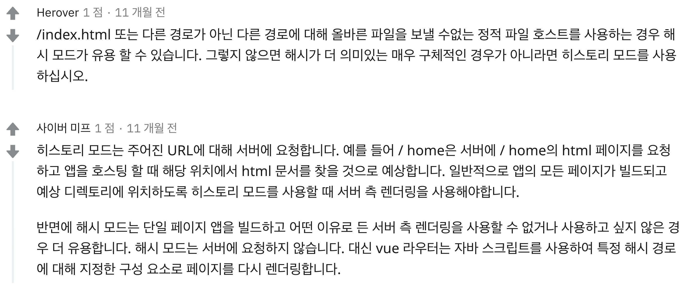 그러나, Vue.js 공식 가이드에서는 Default Mode 가 Hash 모드이고, 이를 History 모드로 변경시 설정해줘야 하는 부분이 추가됩니다. 그런 번거러운 작업이 필요할 만큼 History 모드가 필요하다면 사용해도 되지만, 자칫 잘못 사용하면 홈페이지를 이용하는 사용자에게 404 페이지를 보여주는 나쁜 결과를 초래할 수 있습니다.