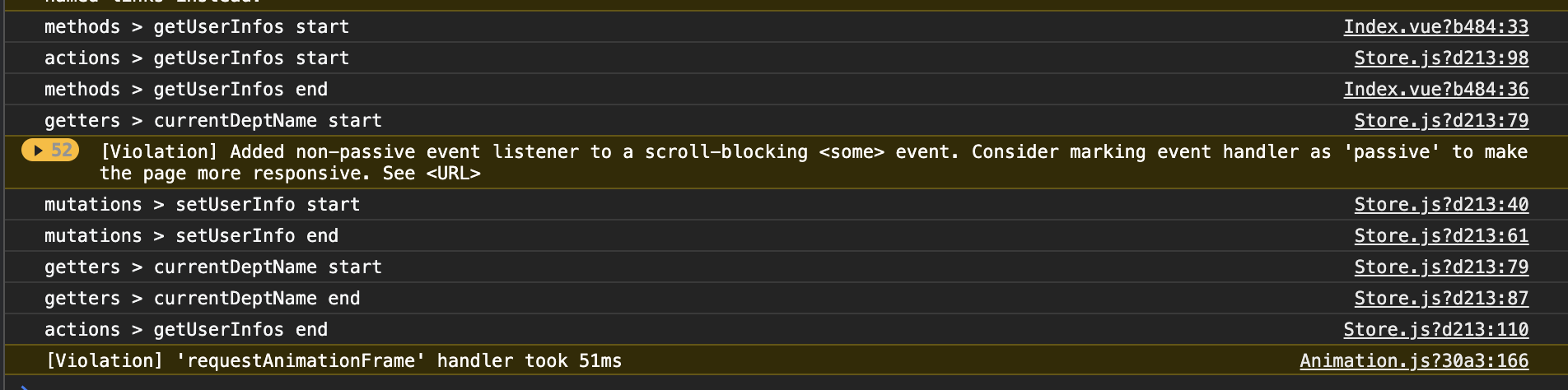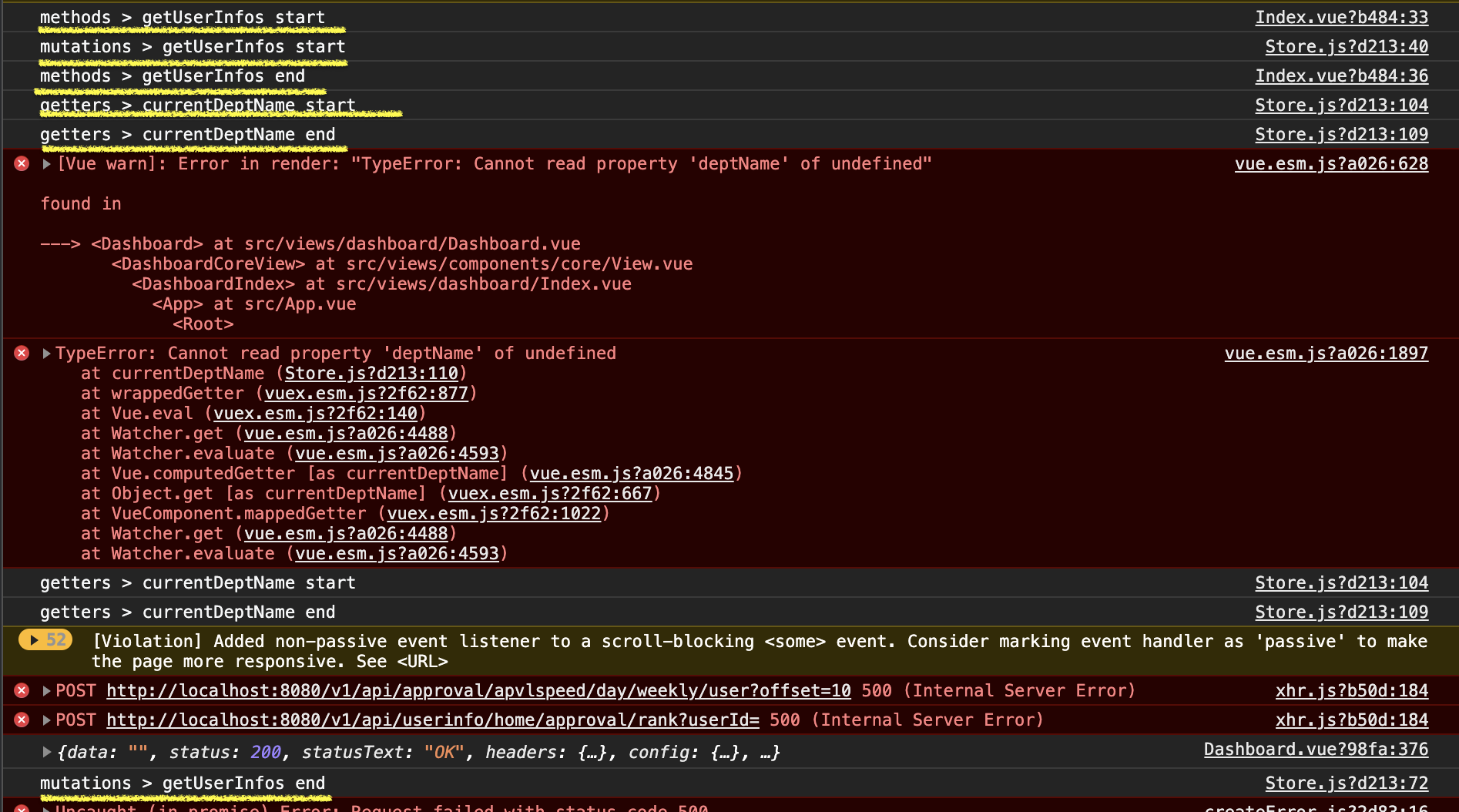 위 코드에서 getters의 currentDetpName 함수는 mutations에서 호출된 Commit 결과 값을 가져와야 했습니다. 그러나, 그러지 못하여 아래와 같은 이슈가 발생했습니다.