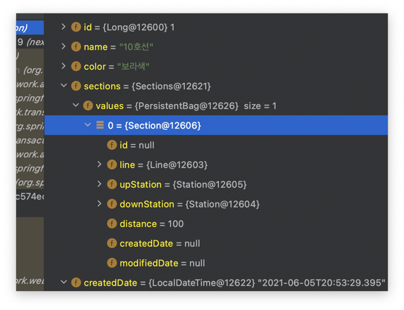 values.addAll(values2); // line1 의 정보를 가져야 한다. 그래서 JPA 에서는 origin line 과 같이 insert 를 하려고 한다.