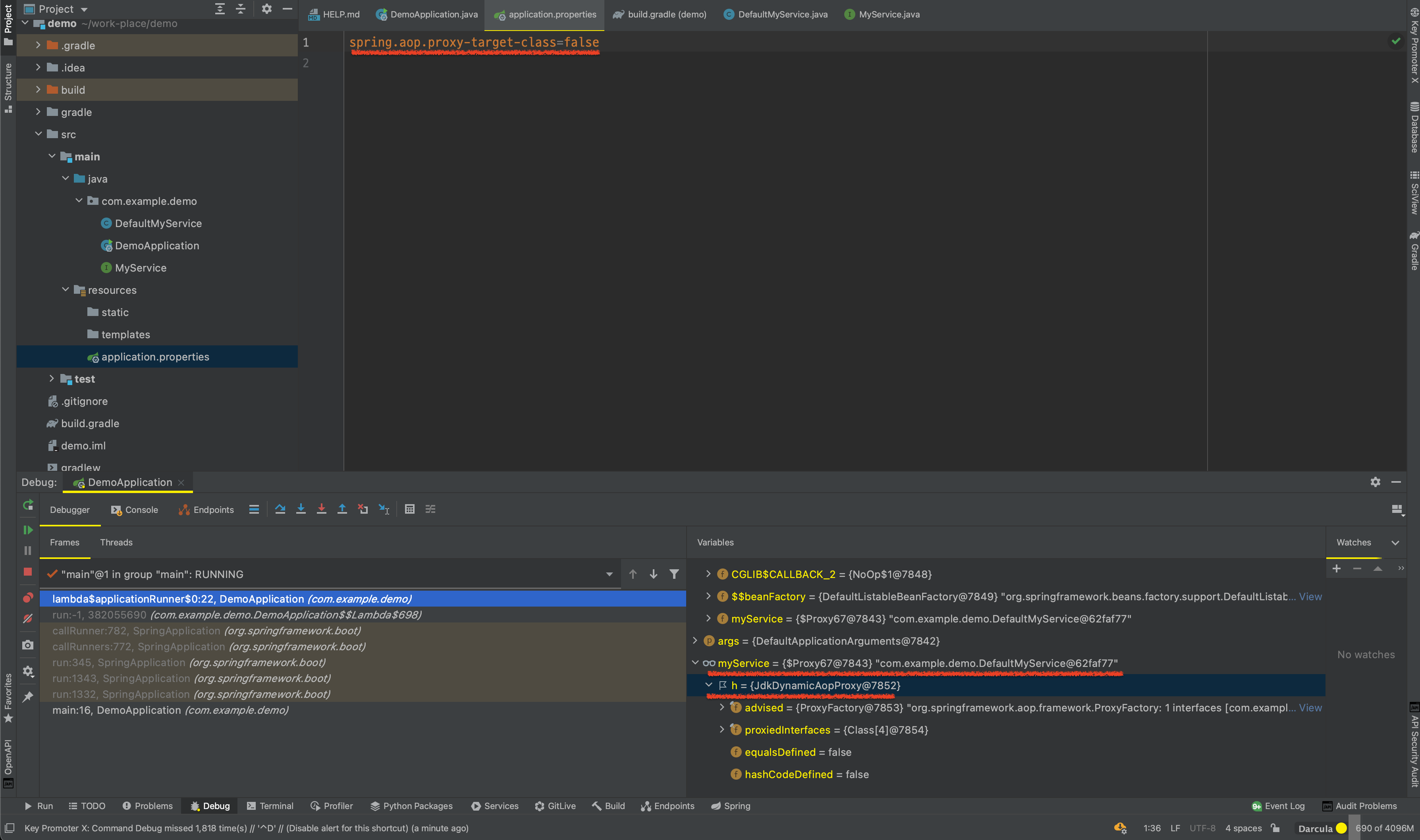 The bean 'defaultMyService' could not be injected as a 'com.example.demo.DefaultMyService' because it is a JDK dynamic proxy that implements: