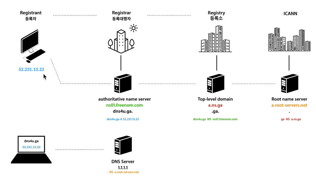 다시말해, dns4u.ga 의 관리 네임서버는 NS ns01.freenon.com <- 이것도 도메인 네임 정보를 저장한다.