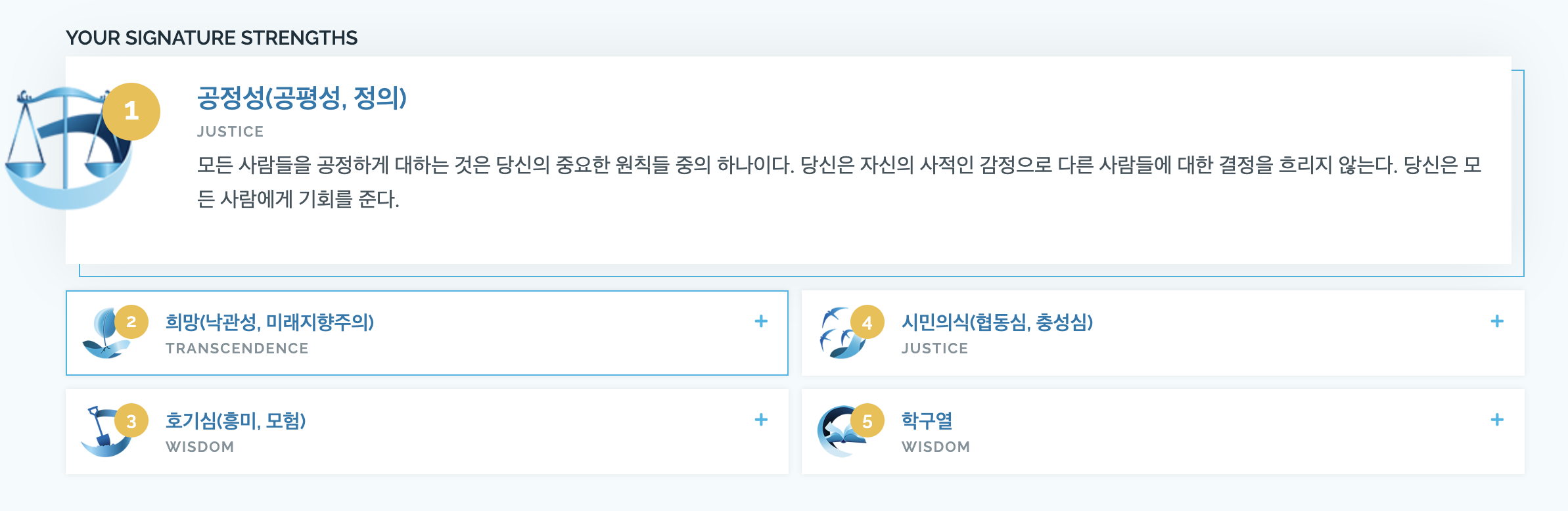 위 설문내용은 https://www.viacharacter.org/ 여기서 강점 테스트를 해본 결과다.