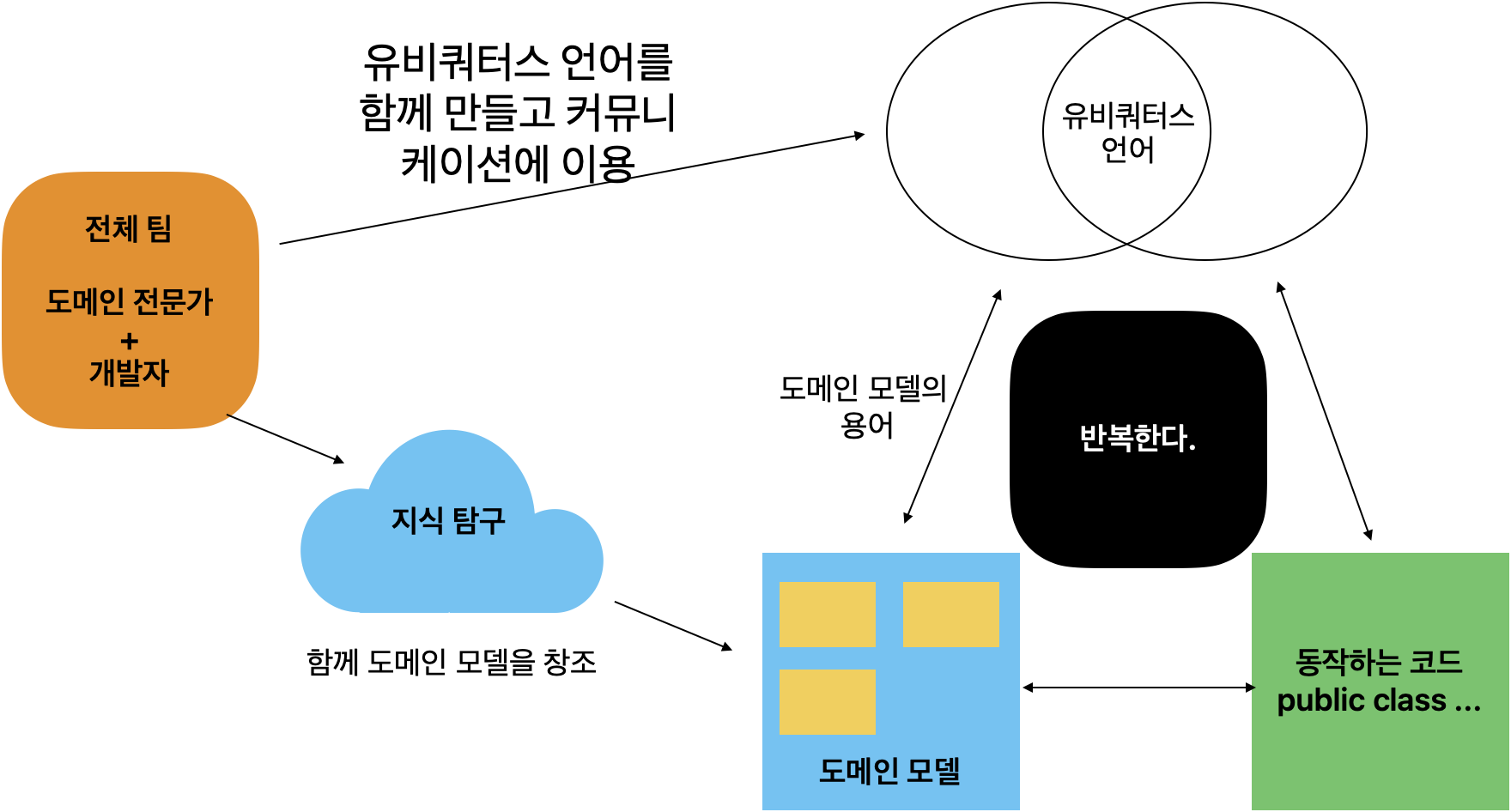 조영호님이 장표를 사전허가 없이 첨부할 수 없어 비슷하게 만들었습니다. 도메인 주도 설계는 도메인 전문가와 개발자가 함께 팀을 이루고 지식을 탐구하여 함께 도메인 모델을 창조합니다. 이때 만들어지는 도메인 모델은 실제로 코드와 일치해야 합니다. 더불어서 모든 커뮤니케이션은 함께 정의된 유비쿼터스 언어를 활용해야 합니다.