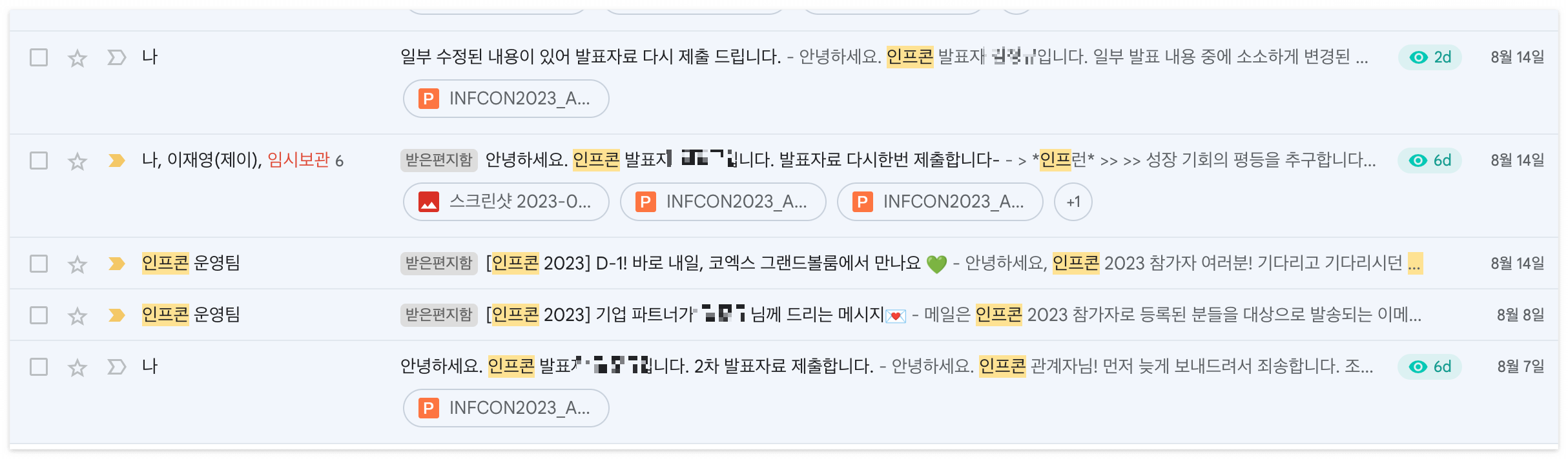 물론 그 과정이 순탄치 않았습니다. 왜 순탄치 않았을까요? 인프콘2023은 8월 15일날 진행되었는데, 발표자로 선정되었던 날이 5월 24일이였으니, 준비기간까지 포함하면 약 3달간의 마라톤을 달린 셈이 되겠네요.