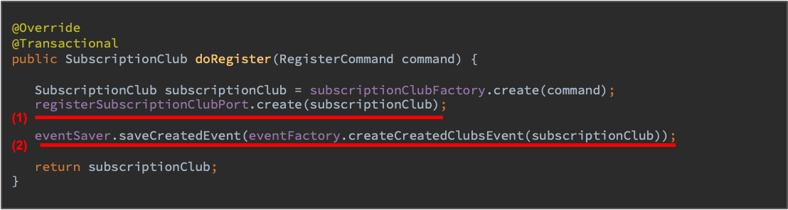 실무에서 좀 더 자세히 살펴보면요. 전 직장에서 이벤트 플랫폼을 구축하던 과정에서 이벤트의 발행 시점을 Aggregate 의 상태를 변경한 후에 이벤트를 발행했습니다. 코드로 살펴보면 아래와 같았습니다.