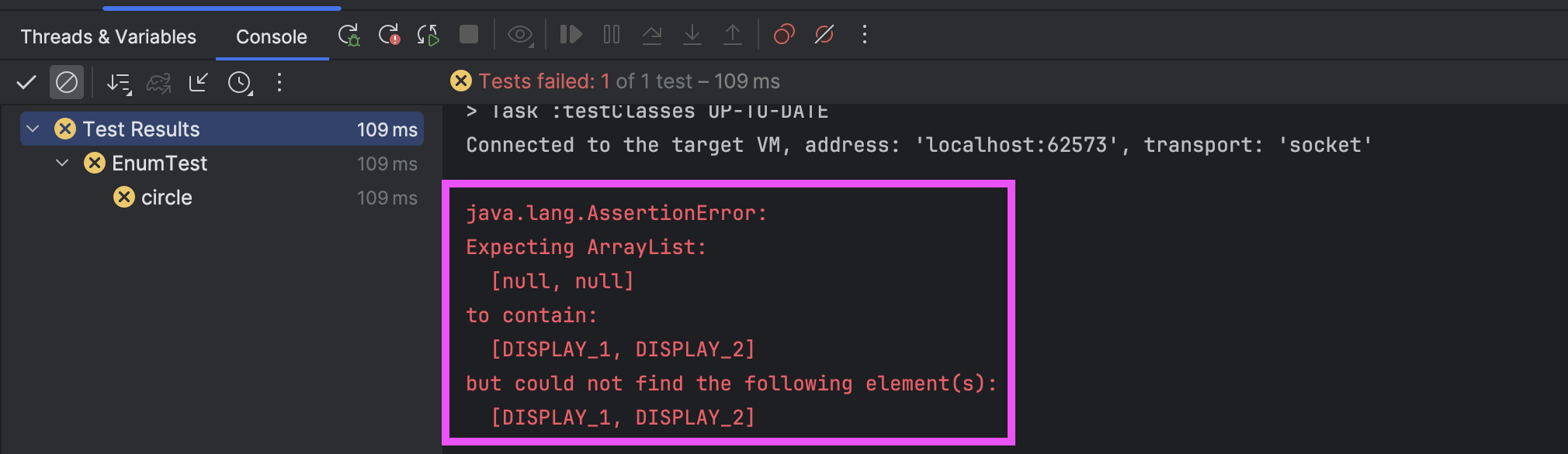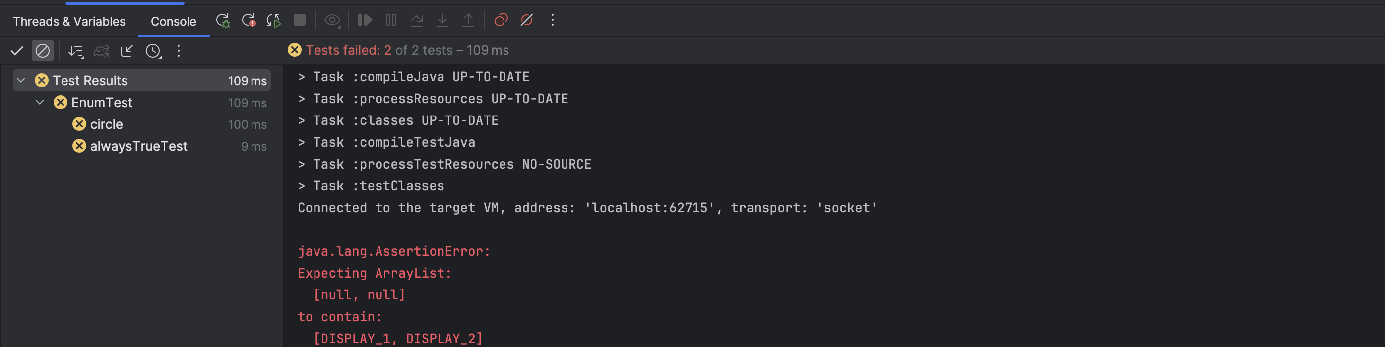 circle 테스트 코드와 alwayTrueTest 테스트 코드를 함께 실행하면 실패하고, alwayTrueTest 코드만 실행하면 성공합니다.