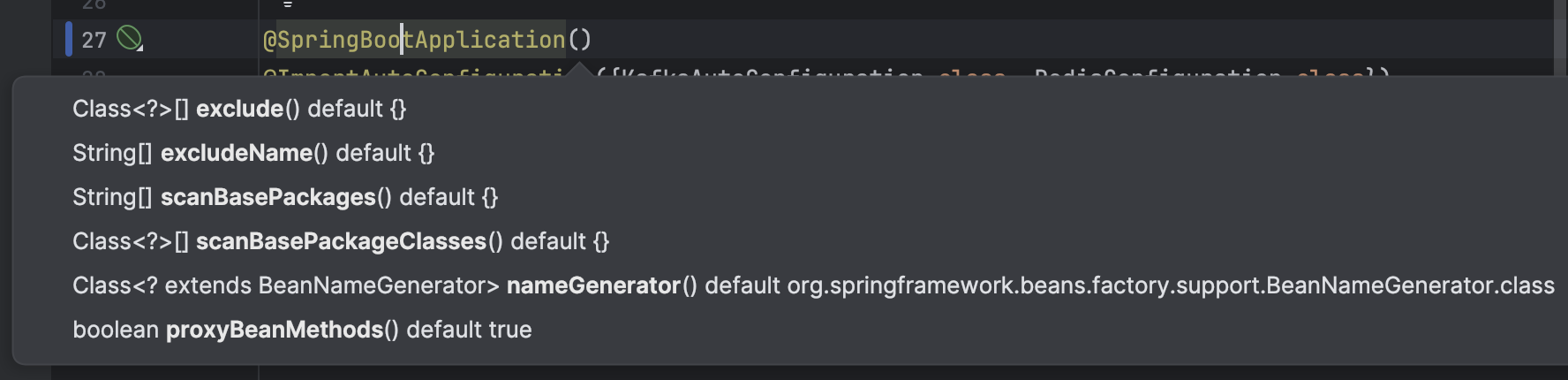 데이터를 위한 데이터인가? 편의성을 제공하기 위한 용도인가? 나의 생각은 편의성을 제공할 수도 제공하지 않을 수도 있다는 생각이 든다. 아마도 Spring Boot 개발해본 사람들은 @SpringBootApplication 에서 제공하는 아래 그림과 같은 다양한 키워드를 알아야만 한다는 사실을 알게 된다.