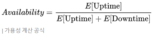 - 가용성(Availability): 서비스가 얼마나 지속적으로 동작 가능한지를 나타내는 지표(Availability = 사용 가능 시간 / 전체 시간) 그러니까, 가용성 99.9% 라고 한다면, 100분 중에 단 1분만이 문제가 발생했다는 것을 의미한다.