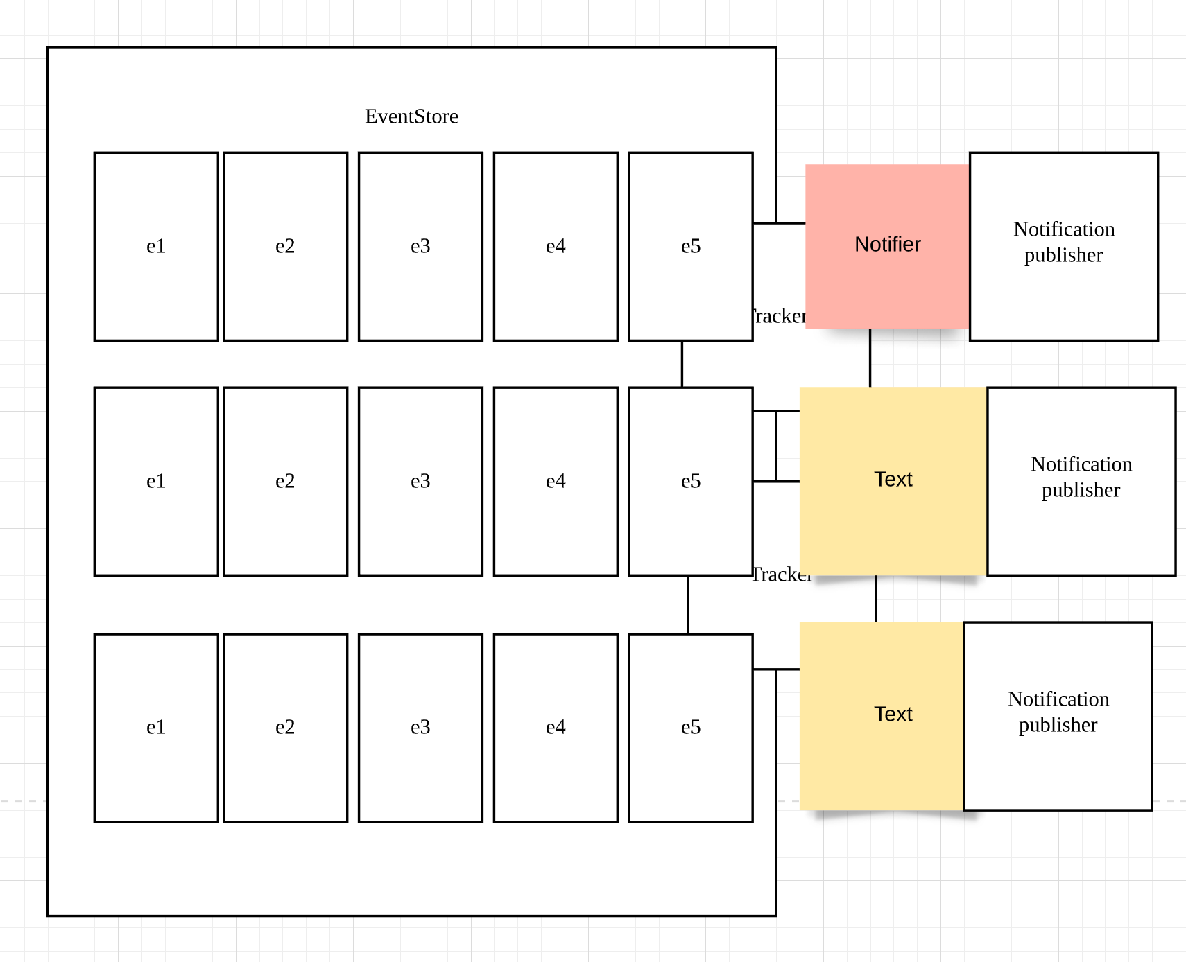 각각의 Notification publisher는 Tracker를 갖고 e1~e3까지는 Notifier에게 이벤트 전달, 그리고 Tracker는 3까지 전달되었다라는 것을 인지하고, e4는 다른 Notifiaction Publisher가 관심을 가진다면, 데이터를 전달해줍니다.