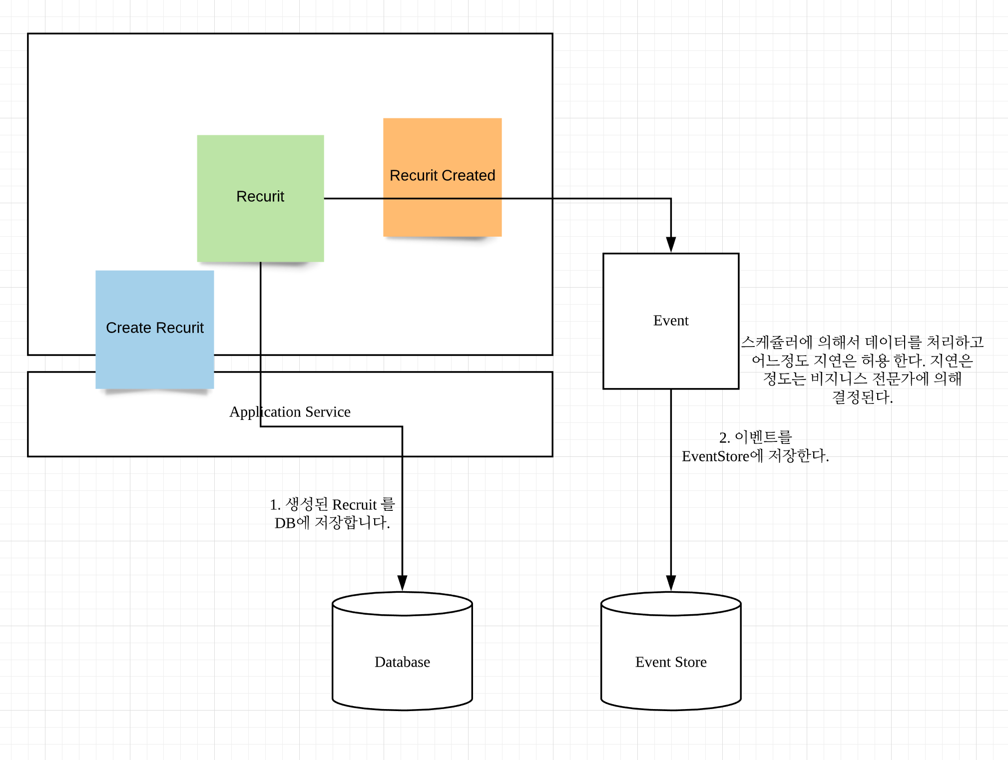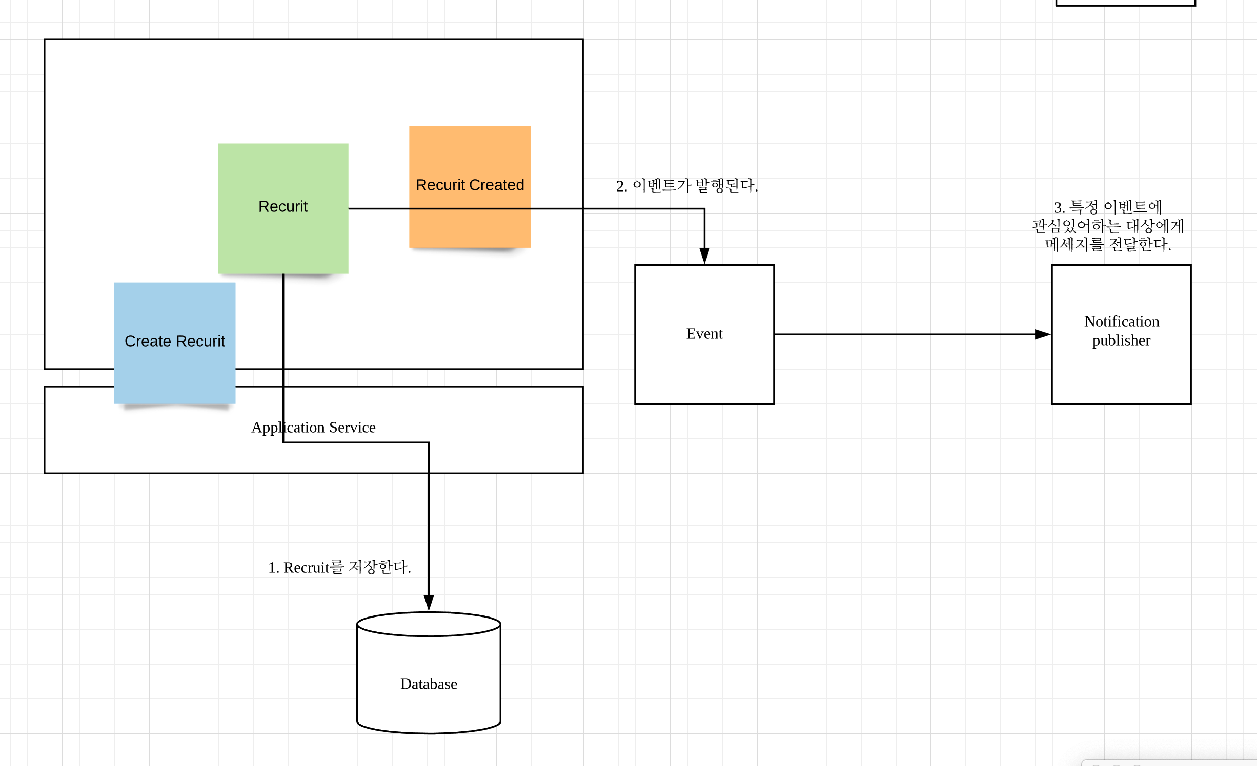구현에 따라 다르겠지만, 위 그림과 같이 1. Recruit를 데이터베이스에 저장한다. 이후로 2. Recruit Created 이벤트가 발행될 것입니다. 그 다음에 발행된 이벤트는 직접적으로 3. 특정 이벤트에 관심있어하는 대상에게 메세지를 전달할 것입니다.