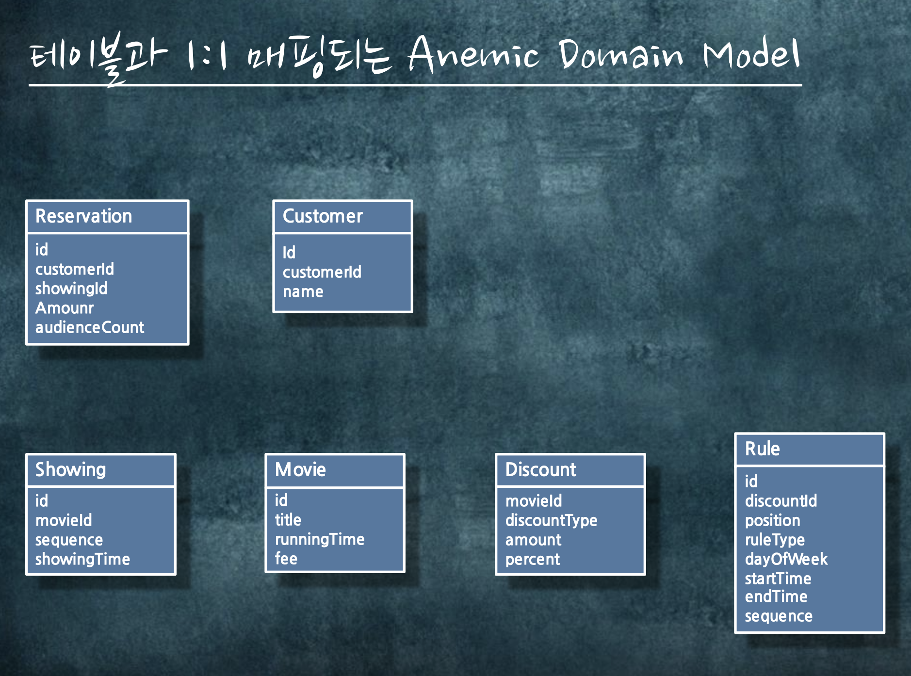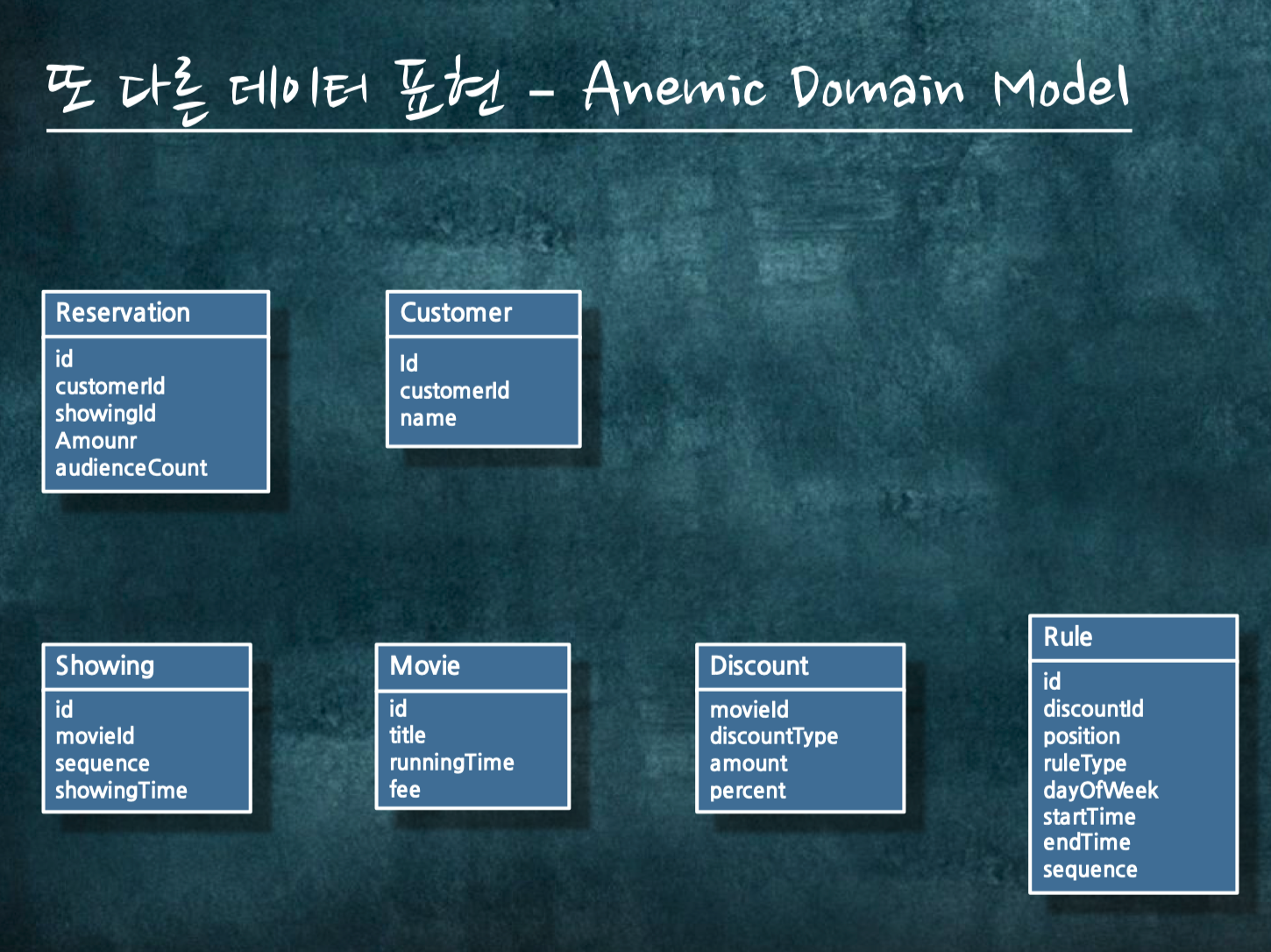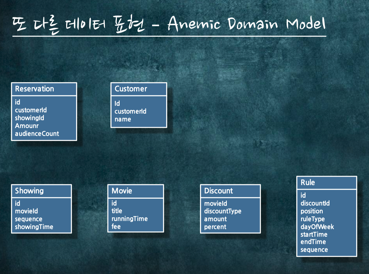 이런게 나왔다면, 데이터 모델과 똑같은 클래스를 딱딱히 맞춥니다. 그러면 그것은 에너믹 도메인이라고 부릅니다.