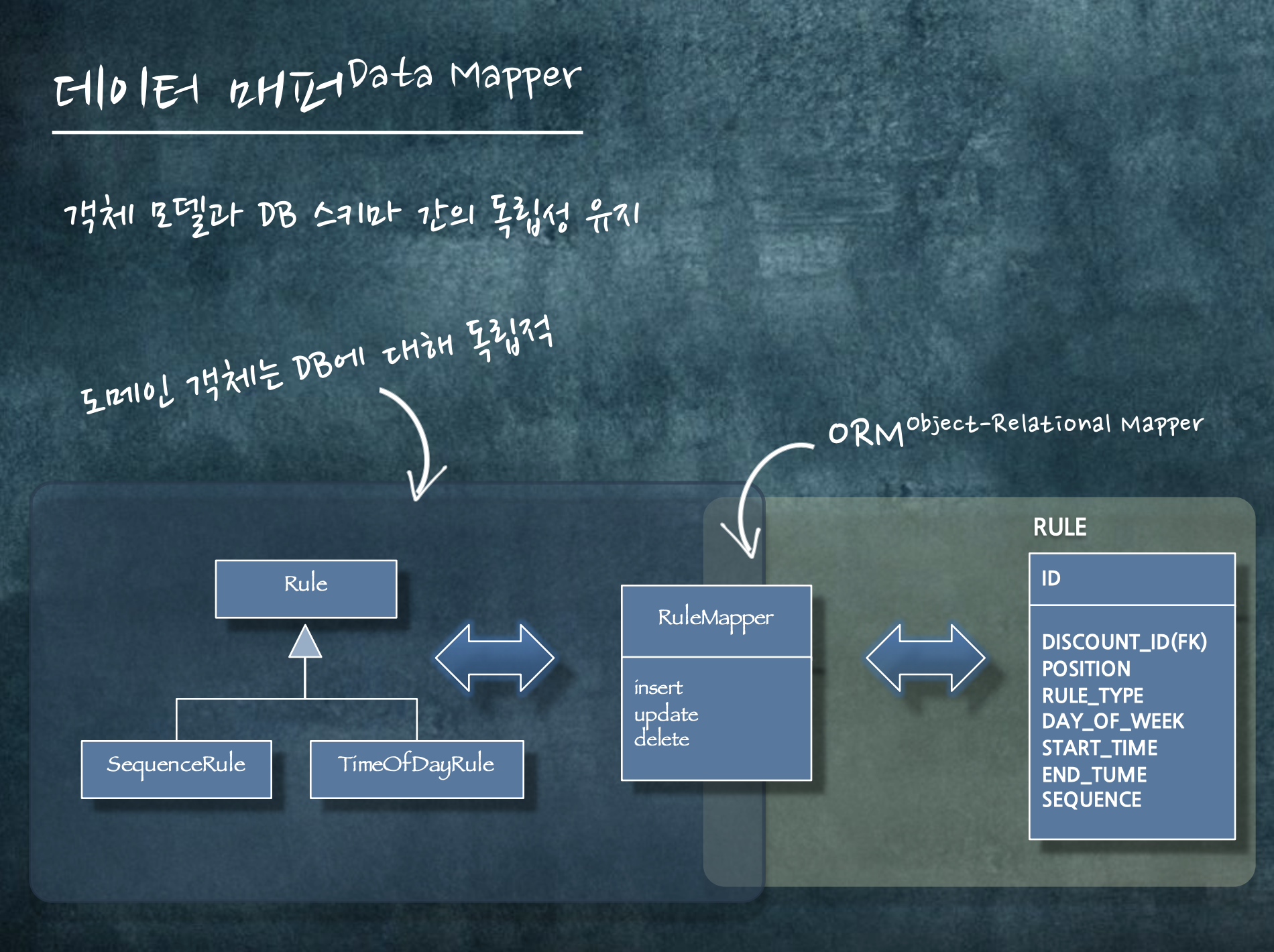 매퍼를 두고, 도메인 객체와 DB간의 결합도를 끊습니다. 이것이 데이터 매퍼를 사용하는 목표입니다.