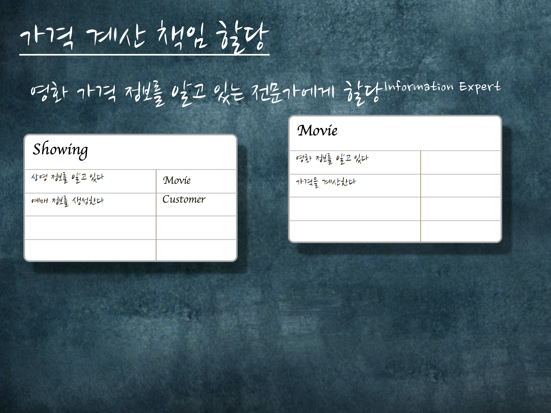 요구사항을 판단하고 이 요구사항을 가장 많은 데이터를 가진 객체에게 책임을 할당합니다.