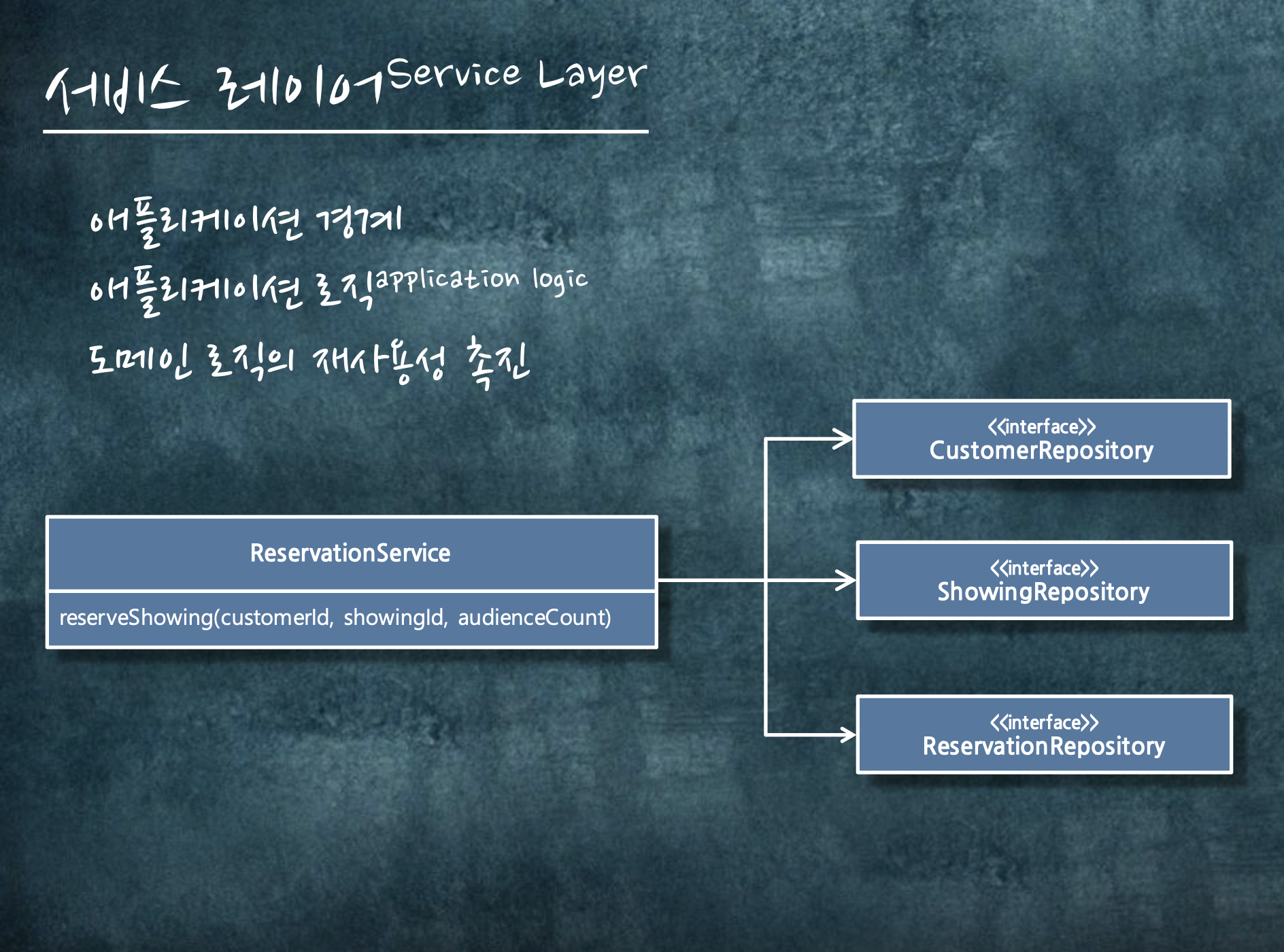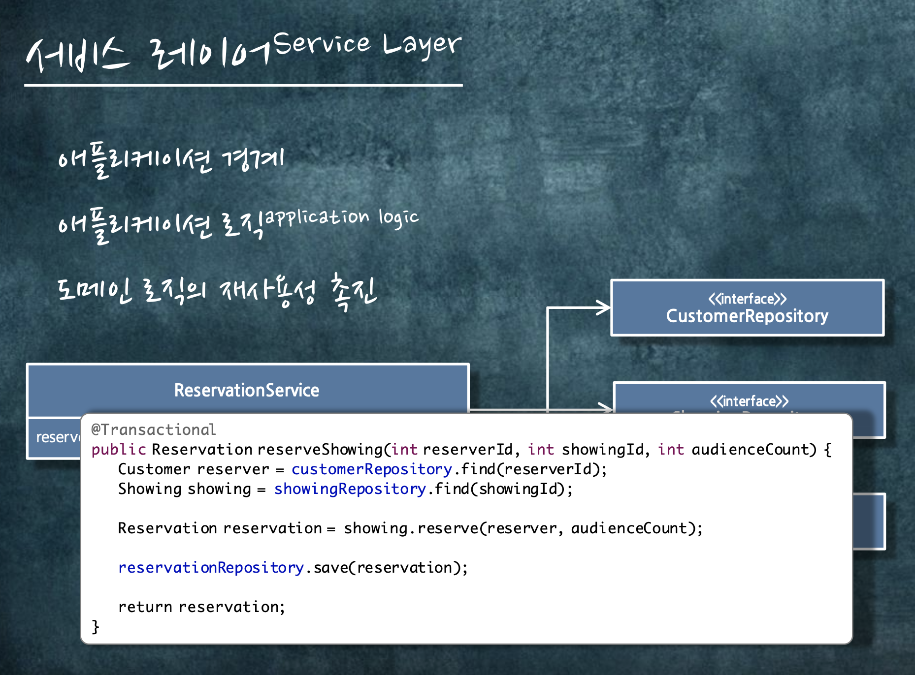 서비스 레이어는 애플리케이션 경계, 로직을 만든다. 그리고 도메인 로직의 재사용성을 촉진합니다.