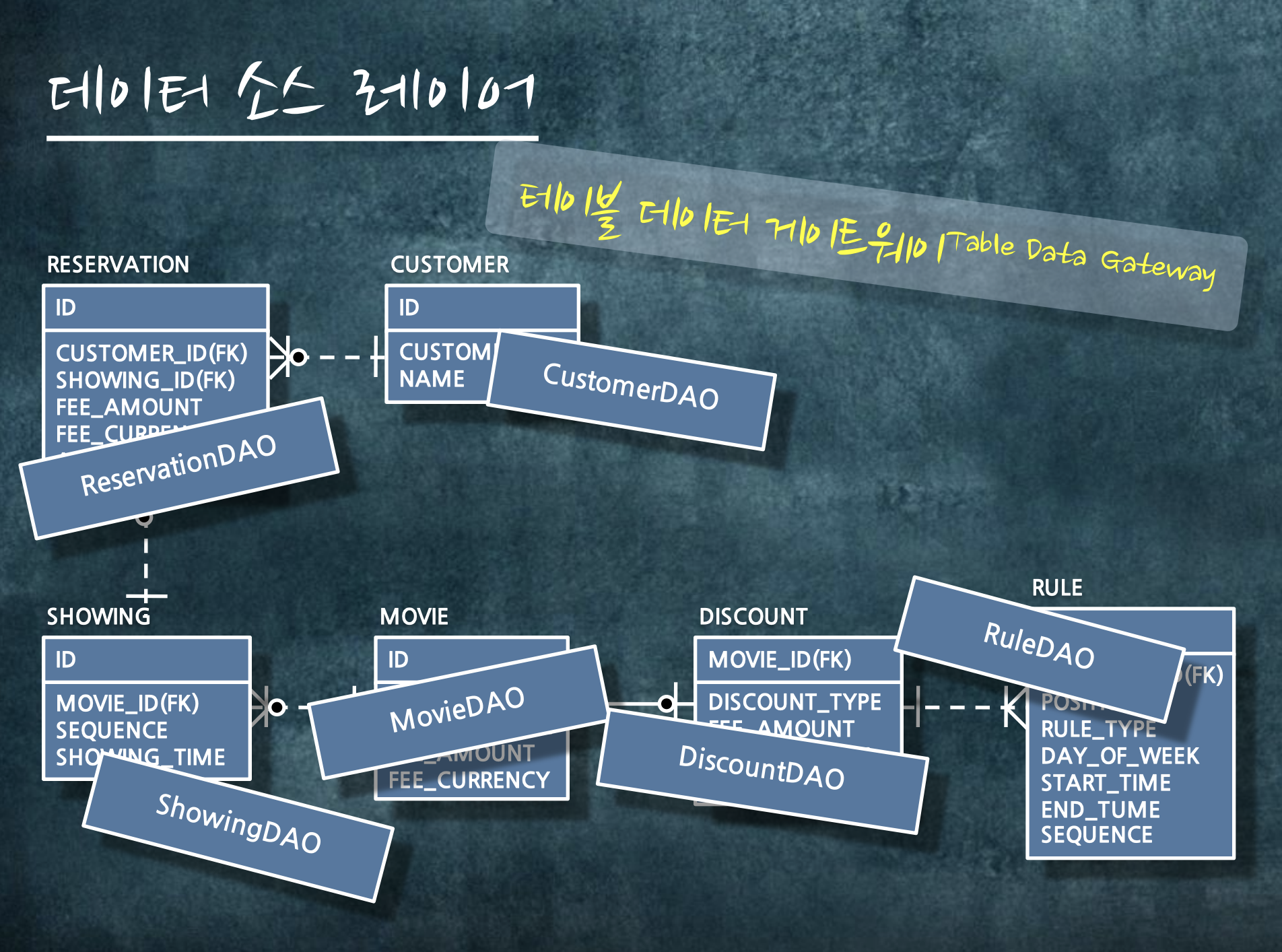 테이블에 데이터를 접근하기 위해 테이블 데이터 게이트웨이라는 것을 만들어 사용합니다. 흔히 부르는 DAO가 해당됩니다.