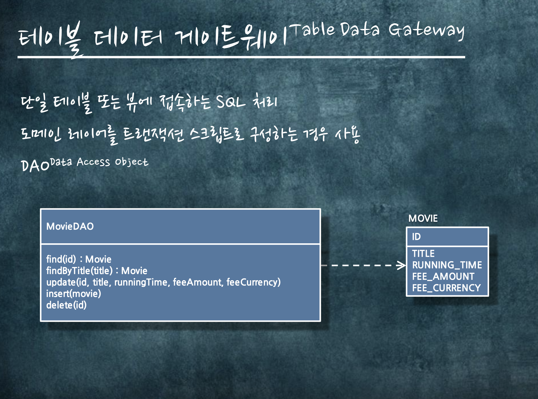 테이블에 데이터를 접근하기 위해 테이블 데이터 게이트웨이라는 것을 만들어 사용합니다. 흔히 부르는 DAO가 해당됩니다.
