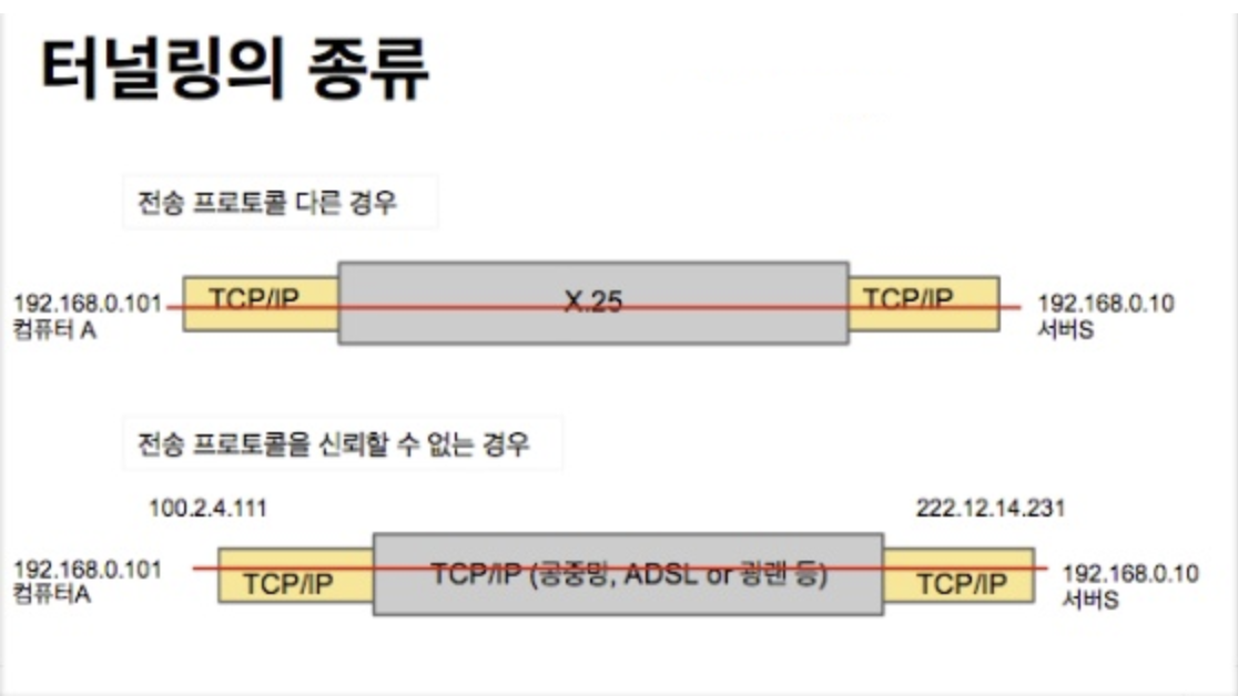터널링이라는 것은 사전적 의미로 실제 통신을 위해 사용을 원하는 특정 프로토콜(ex, IP)를 이를 지원하지 못하는 네트워크 프로토콜(X25망, ATM망)이나 신뢰성이 부족한 네트워크(공중망)에 캡슐화를 통해 전달하는 기술을 말합니다.