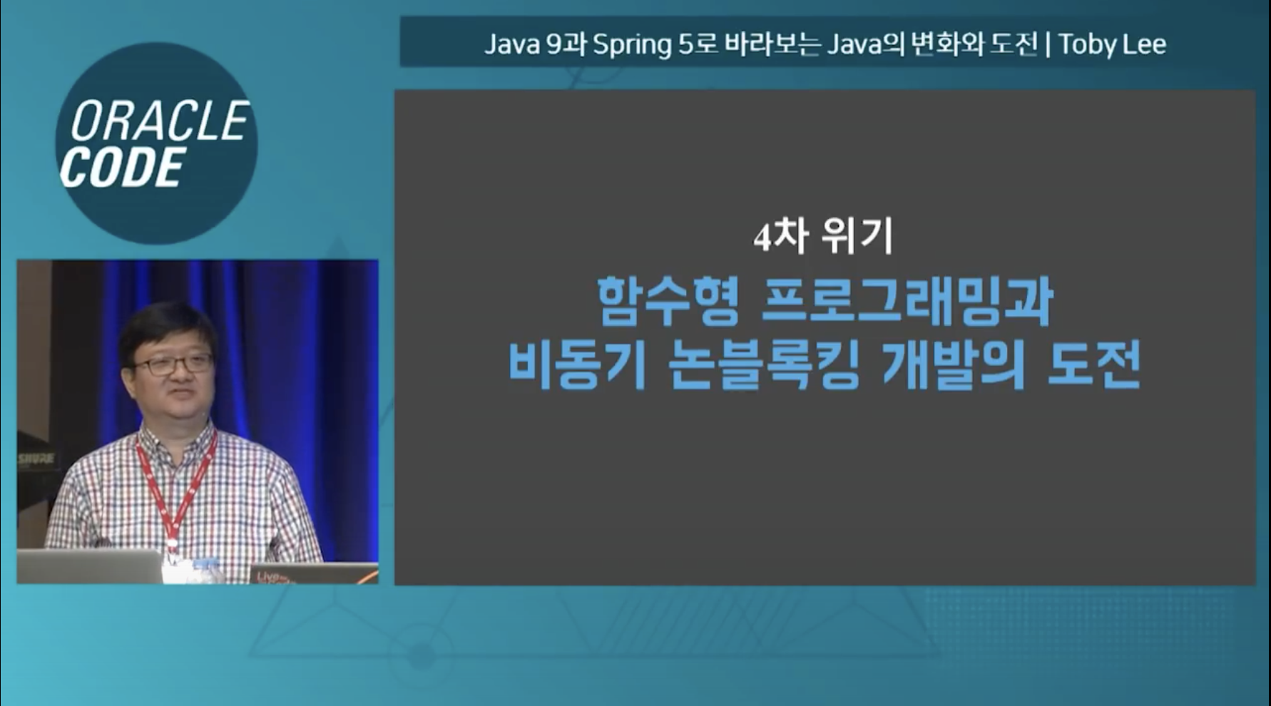 이런 상황에서 또다른 위기를 자바는 겪습니다. 바로 "함수형 프로그래밍과 비동기 논블록킹 개발의 도전"