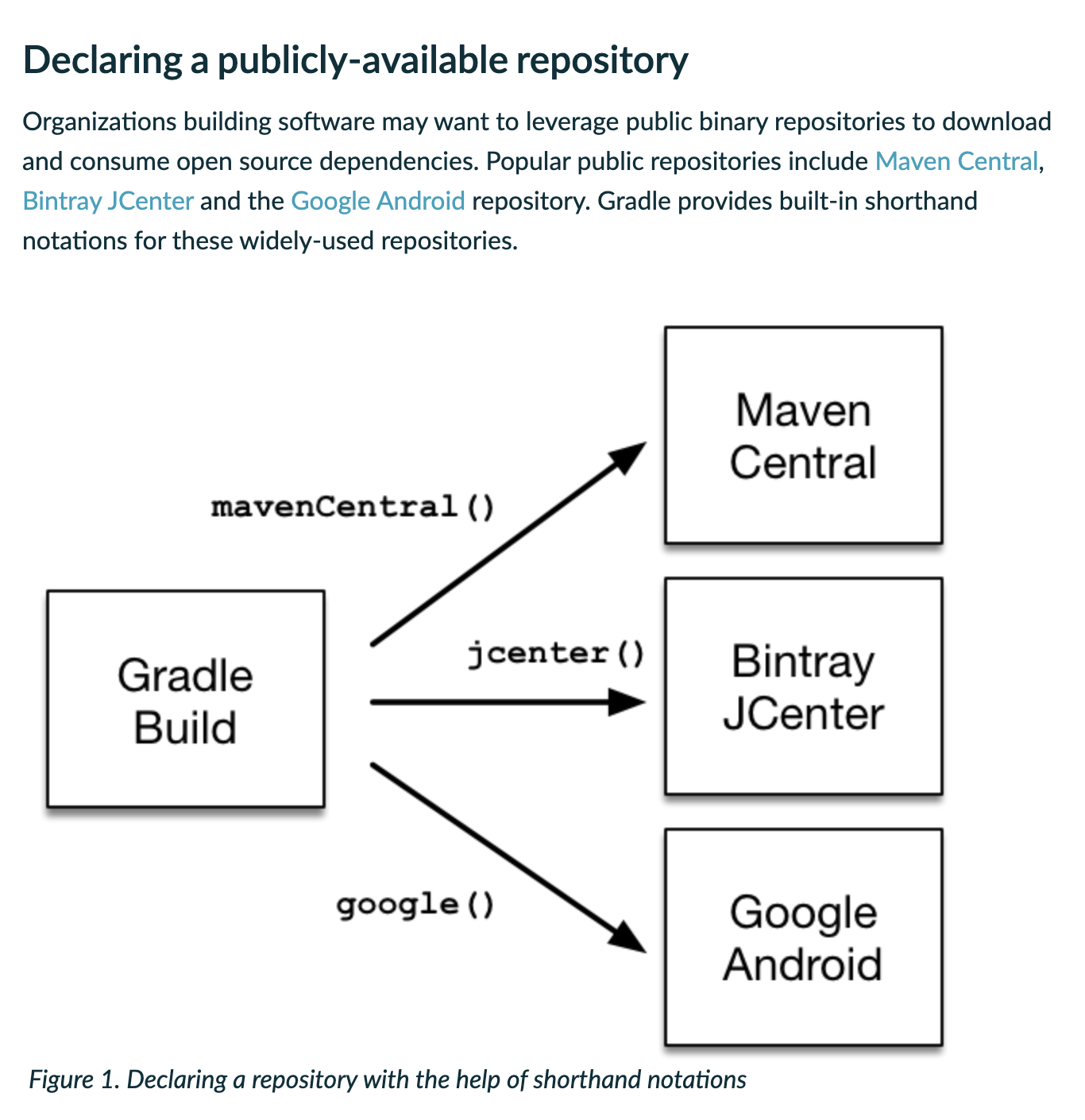 아래는 Gradle의 공식 문서에 나온 내용입니다. maven, Bintray 그리고 google 총 가지의 Repository를 사용할 수 있음을 확인했습니다.