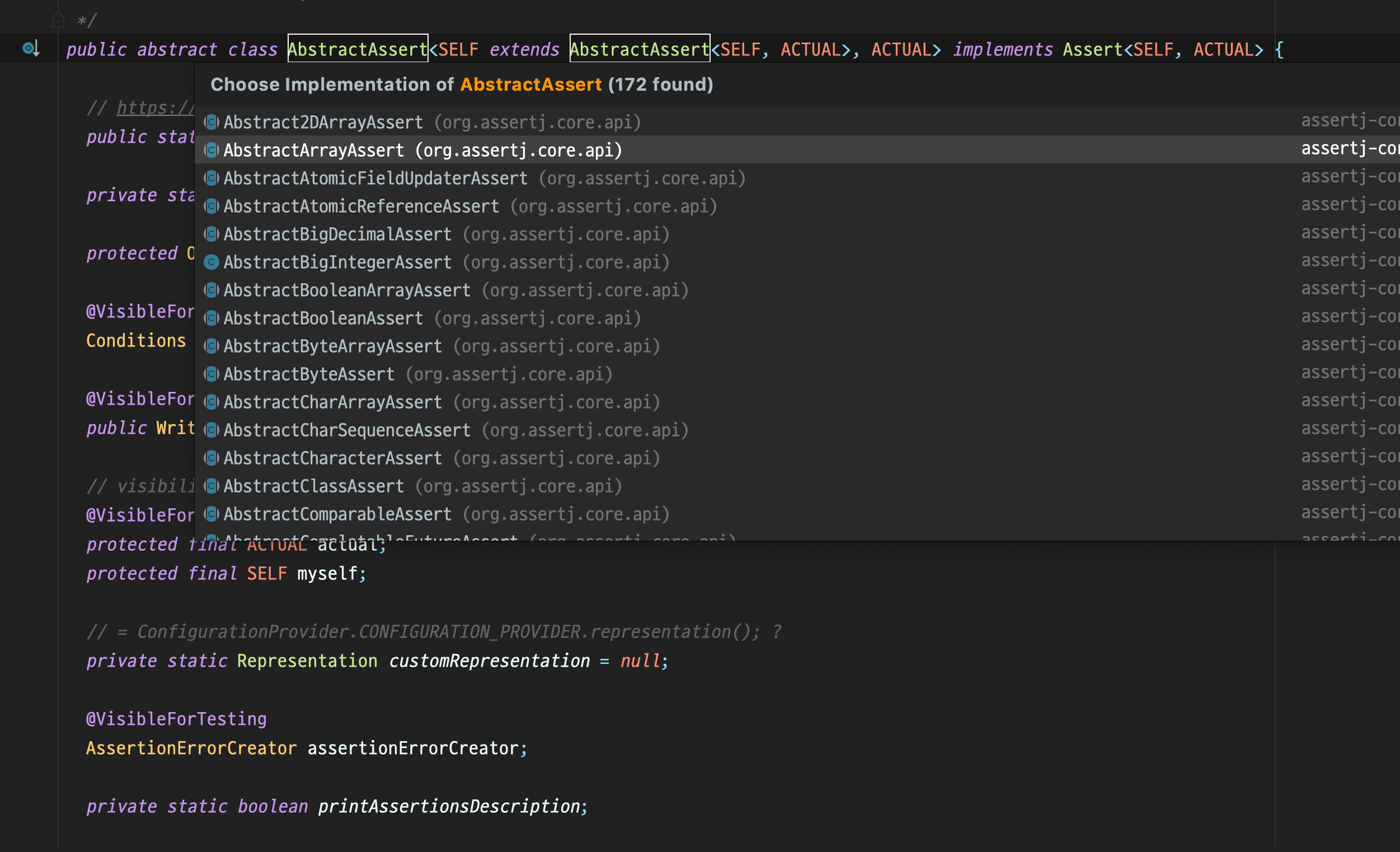 타입을 결정해줄 수 있는 제네릭을 사용한다고 해도 각 타입의 역할은 다를 것이고, 라이브러리가 되기 위해서는 모든 타입에 대처가능해져야만 할 것입니다. 실제로 AssertJ 의 코드를 살펴보니 아래와 같이 타입이 많았습니다.