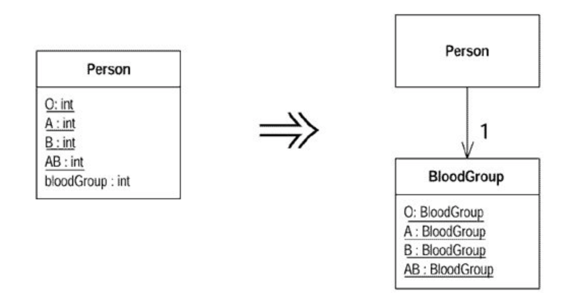 데이터 값이 분류 부호일 땐 그 값이 기능에 영향을 주지 않는다면 분류 부호를 클래스로 전환(Replace Type Code with Class) 을 고려합니다.