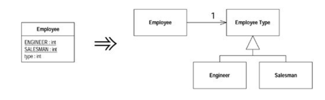 - 이 작업은 타입 코드가 다른 동작을 유발하지 않는 경우에만 적용됩니다. Switch문에 사용되어 다른 동작을 유발하는 경우에는 먼저 Conditional with Polymorphism, Replace Type Code with Subclass, Replace Type Code with State/Strategy를 이용하여 타입코드를 처리하여야 합니다.