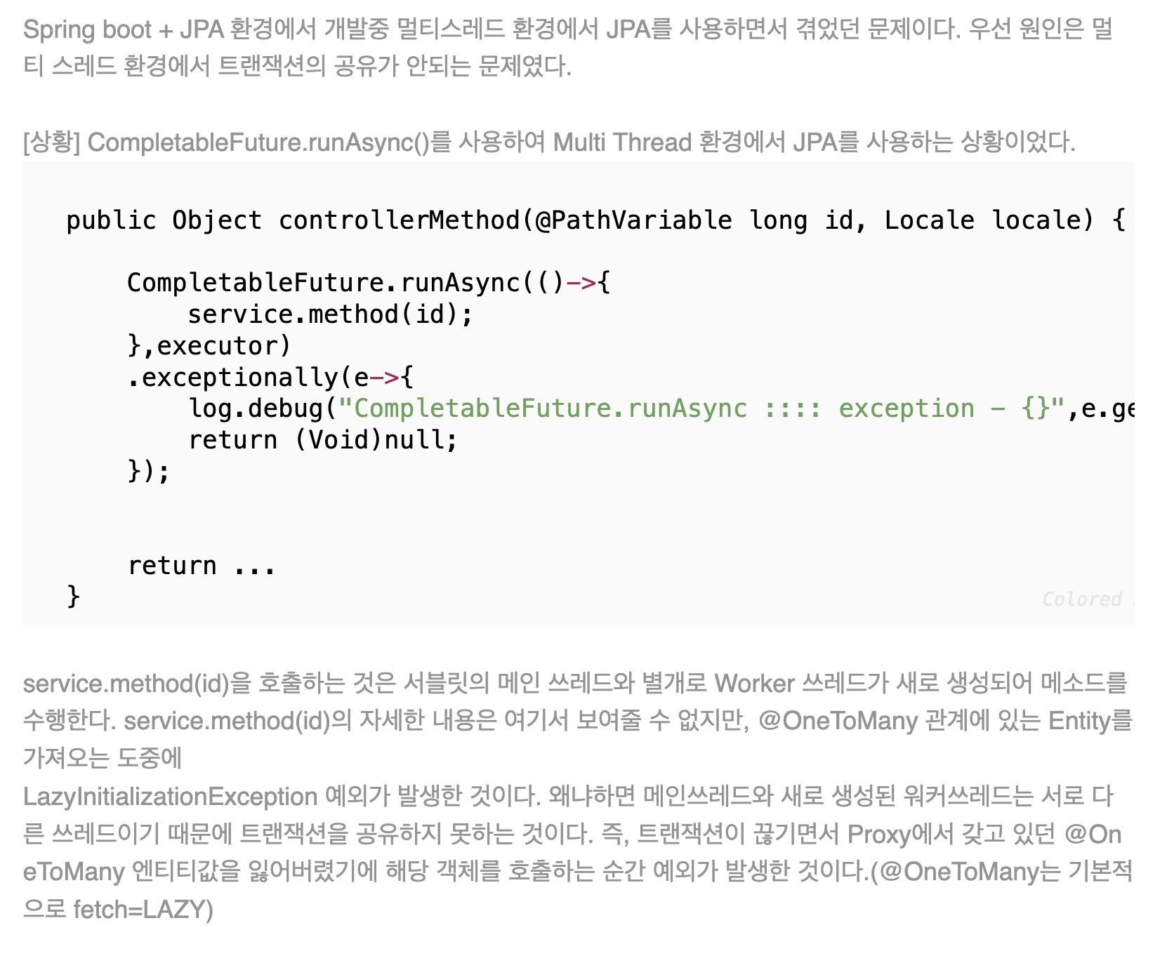다양한 이유에서 LazyInitializationException 가 발생할 수 있는데, 인터넷으로 찾아본 바로는 3가지 정도가 있었습니다.