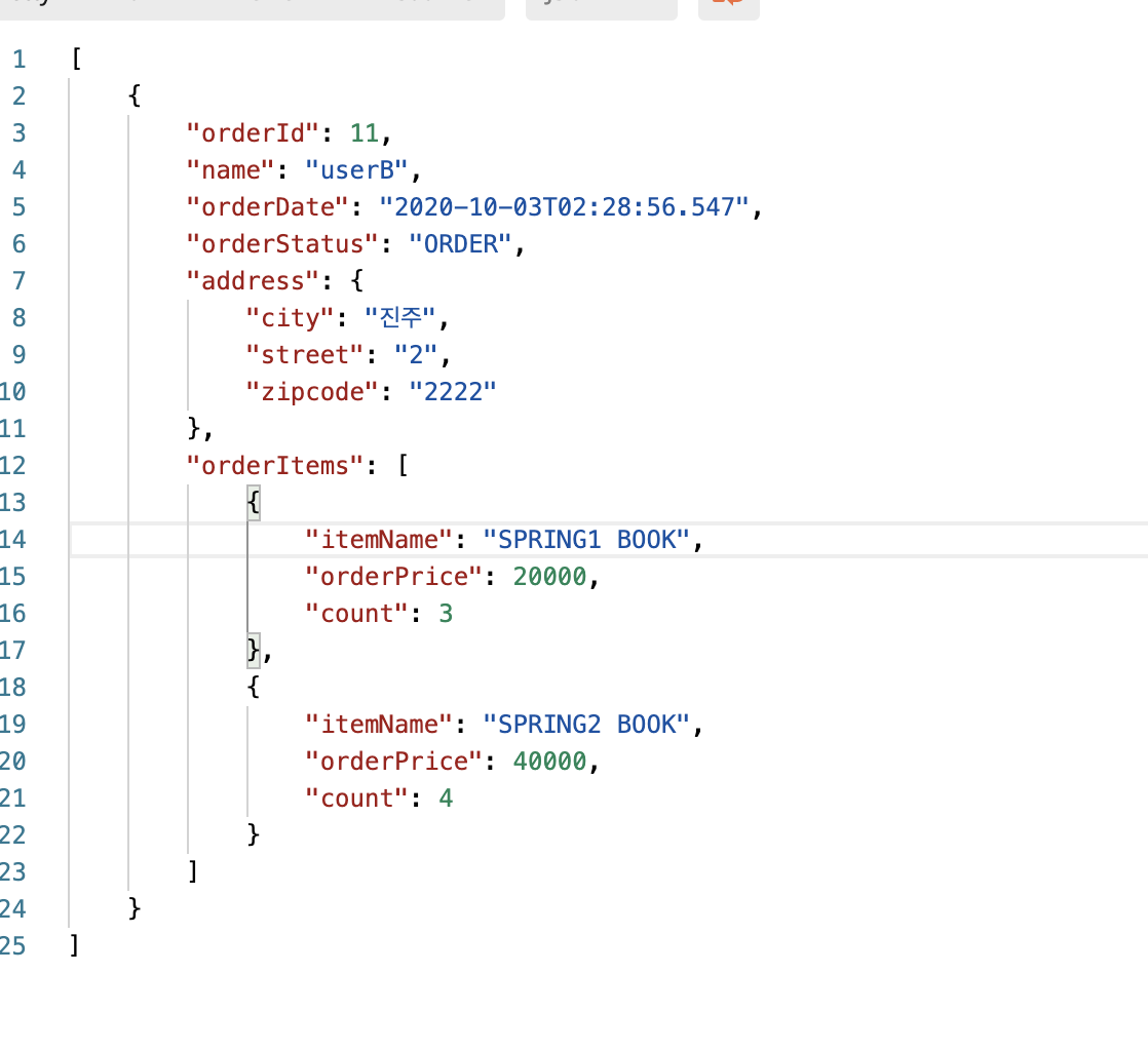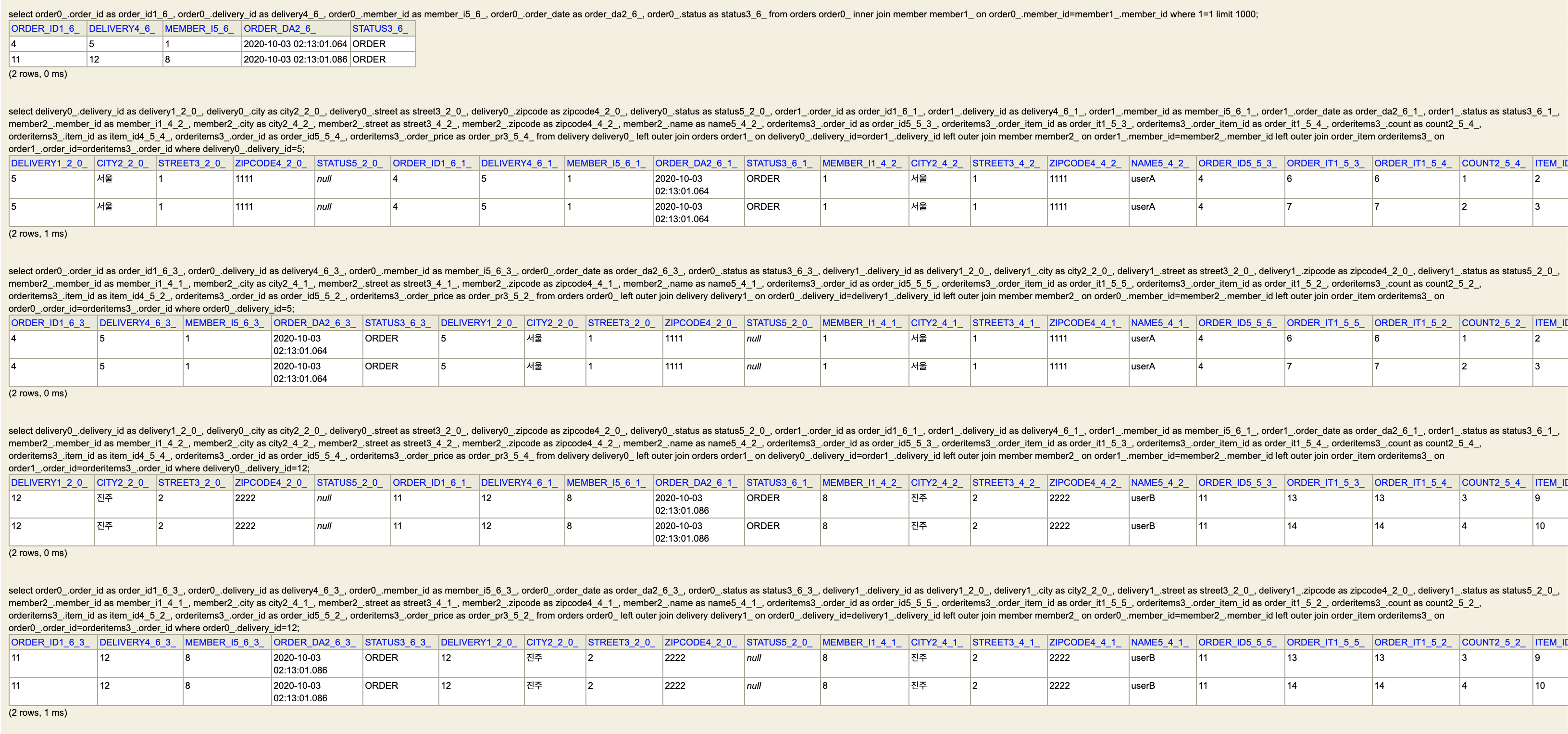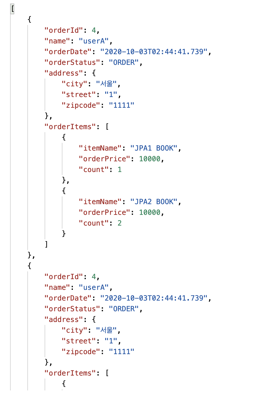 이 결과로 알 수 있는 것은 OneToMany 연관관계에서 조인을 할 때는 데이터베이스의 Row가 증가합니다. 그 결과 같은 Order 엔티티의 조회 수가 증가하게 되고, 이를 막기 위해 distinct 를 SQL에 추가했습니다.