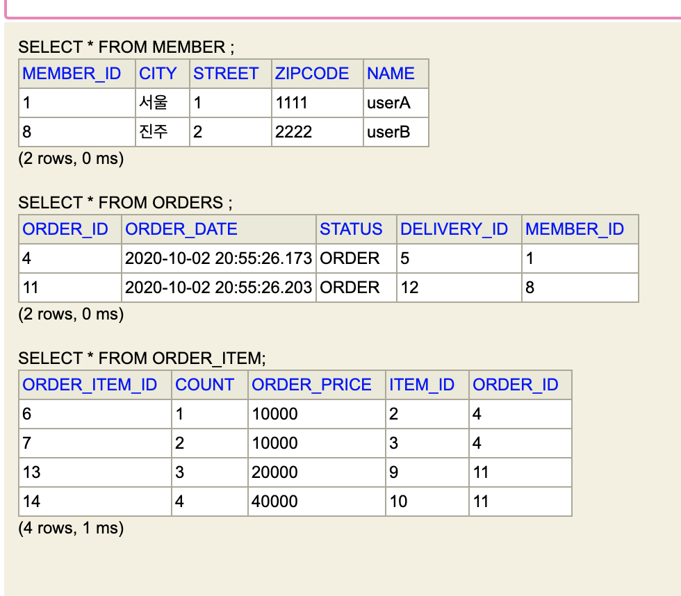 복수의 ORDER 에는 하나의 고객 ID가 존재할 수 있고, 하나의 ORDER에는 다양한 ORDERITEM이 존재할 수 있는 연관관계를 갖고 있습니다.
