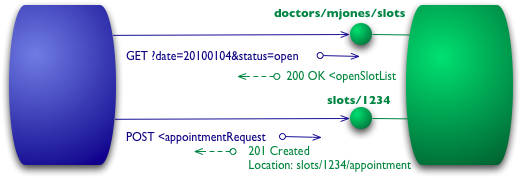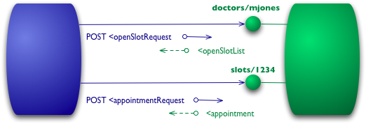 차이점은 테스트 예약과 같이 약속에 대해 어떤 조치를 취해야하는 경우, 먼저 위 URI와 같은 URI가 있을 수 있는 appointment resources를 가져와 http://royalhope.nhs.uk/slots/1234/appointment 해당 리소스에 게시한다는 것입니다.