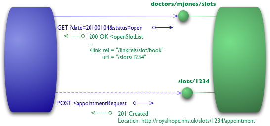 차이점은 테스트 예약과 같이 약속에 대해 어떤 조치를 취해야하는 경우, 먼저 위 URI와 같은 URI가 있을 수 있는 appointment resources를 가져와 http://royalhope.nhs.uk/slots/1234/appointment 해당 리소스에 게시한다는 것입니다.
